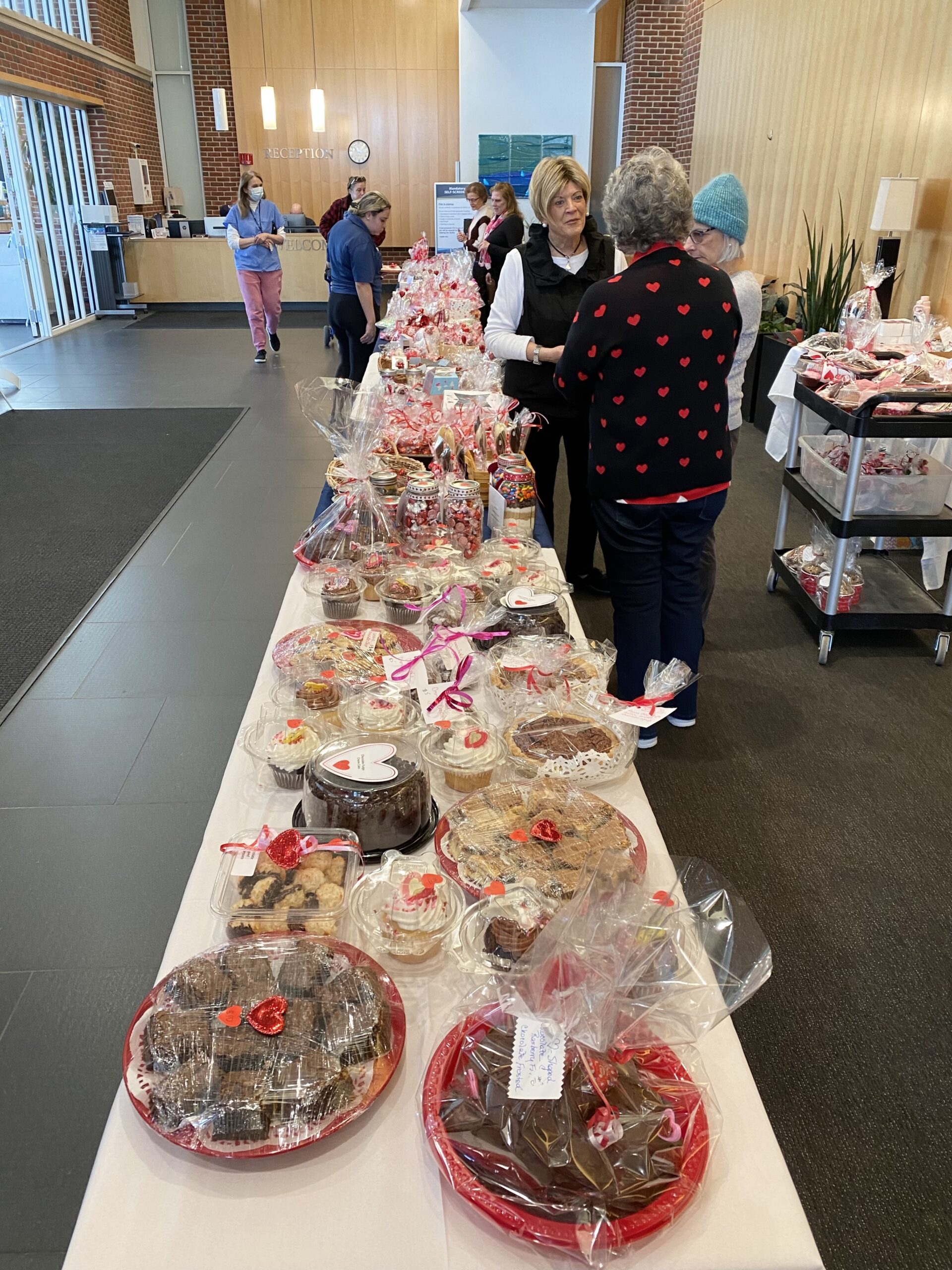 Our tables overflowed with chocolate candy, brownies, cookies, cakes, fudge, and so much more. The staff and visitors who stopped by were so generous and grateful for the treats and the Auxiliary’s support of the Hospital. Lots of pre-Valentine’s gifts were purchased.