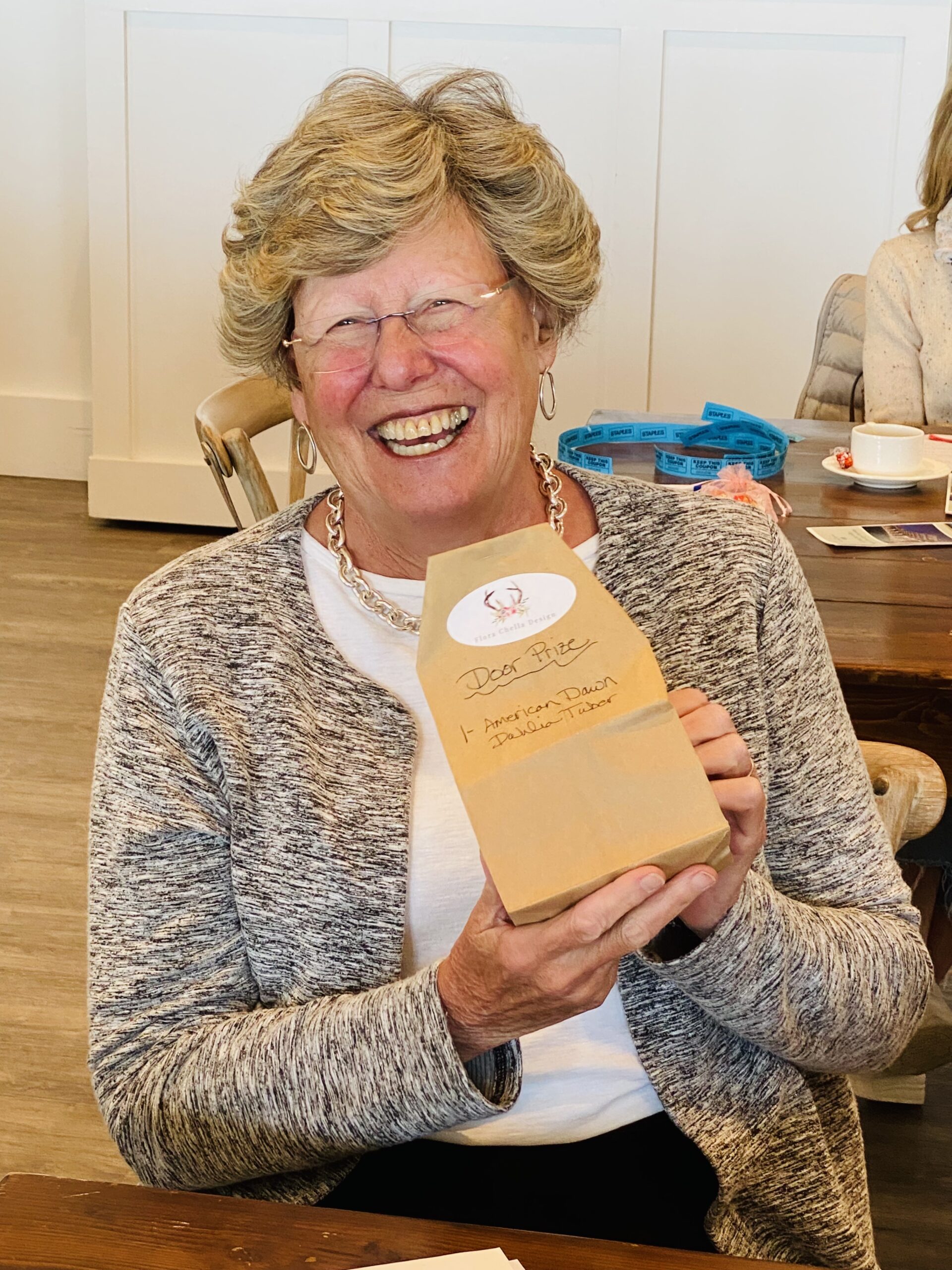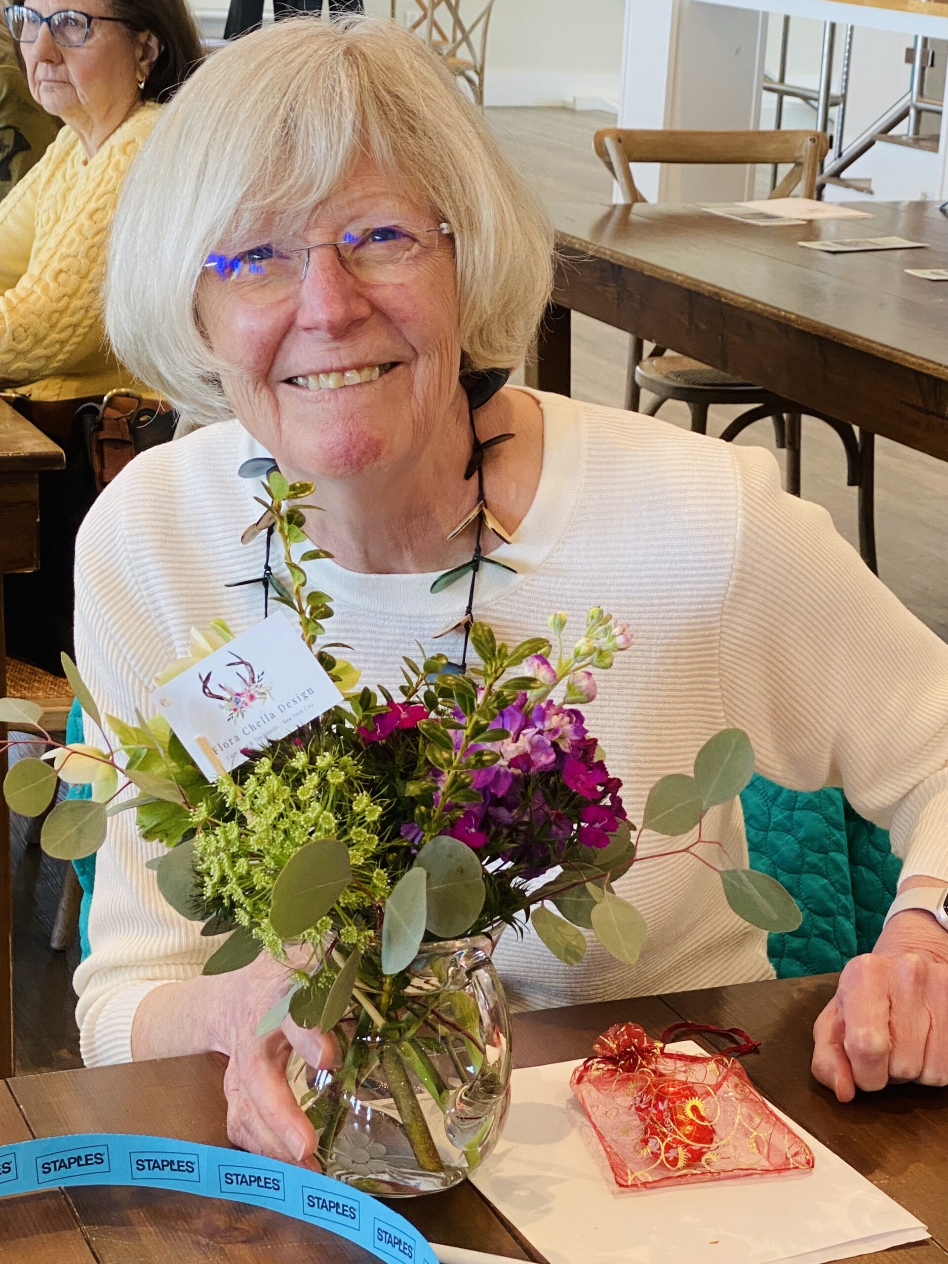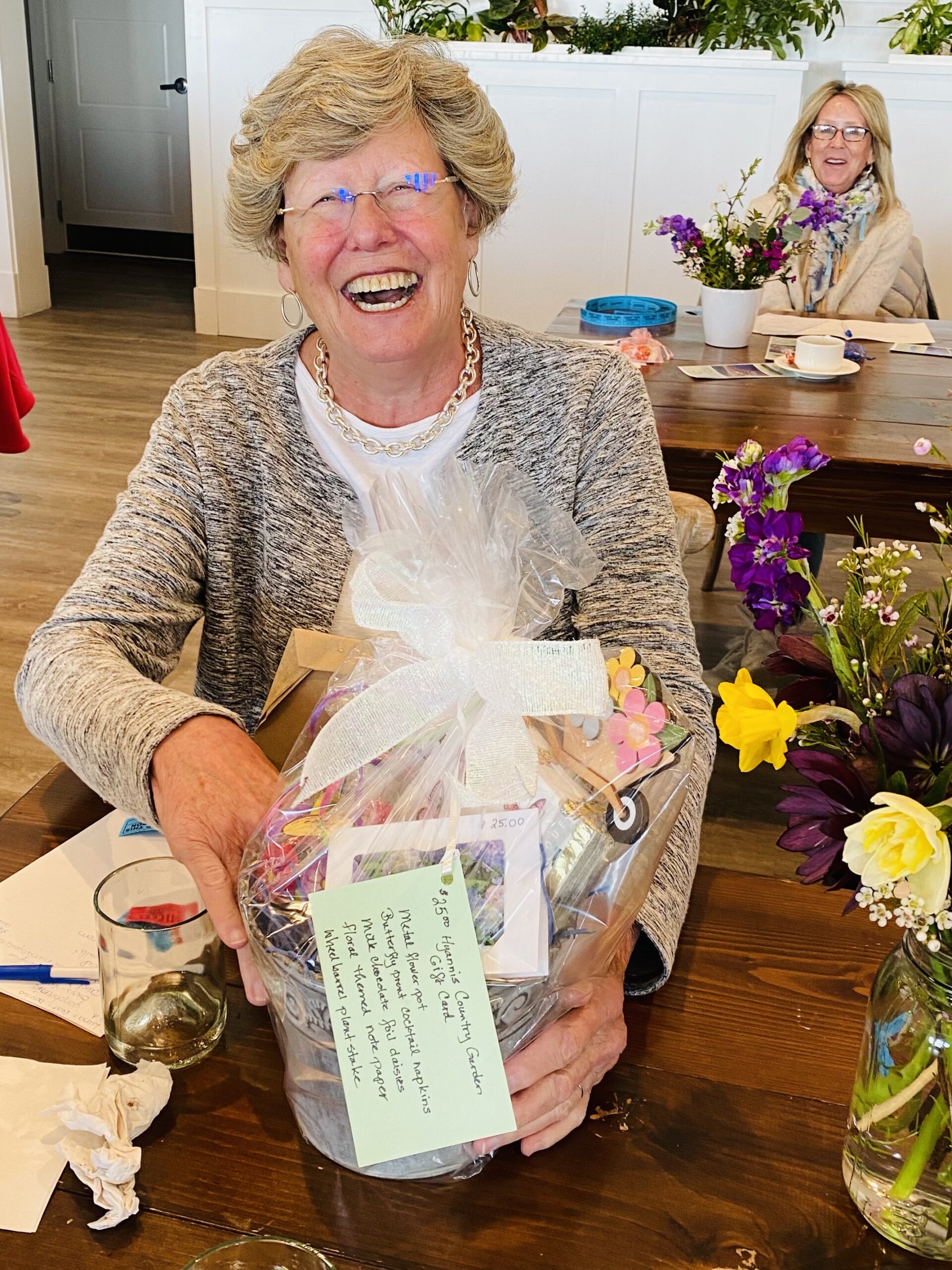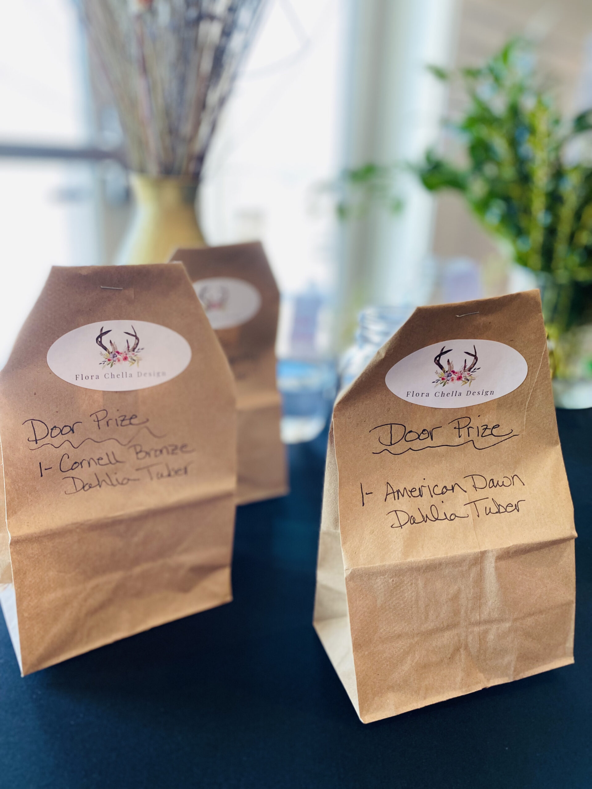 Raffle prizes included the beautiful arrangements Kate made, several bags of Kate’s favorite and prized dahlia tubers, gift baskets, and more. Many smaller arrangements were given out as door prizes.